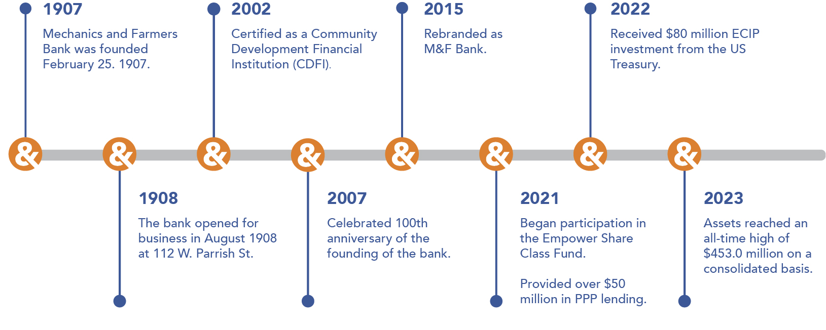 Over 100 years later and the ideals behind this policy have not changed. M&F Bank aims to continue that history and be a resource for the members of our communities, enhancing their financial prosperity. We were then, and still are now, in the business of empowering dreams.